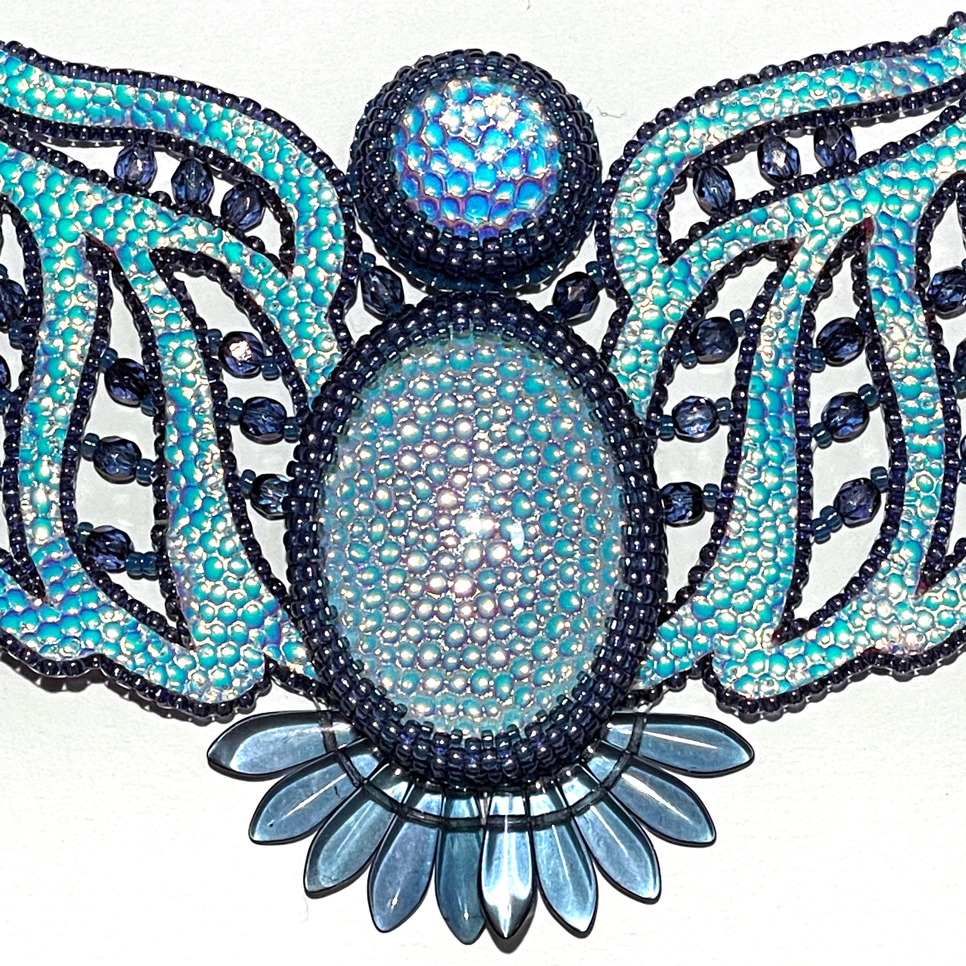 These change colours as they are moved and shift in the light from pale champagne gold colours to blue and purple. They look more blue in the necklace I created as they are bezelled with blue beads.