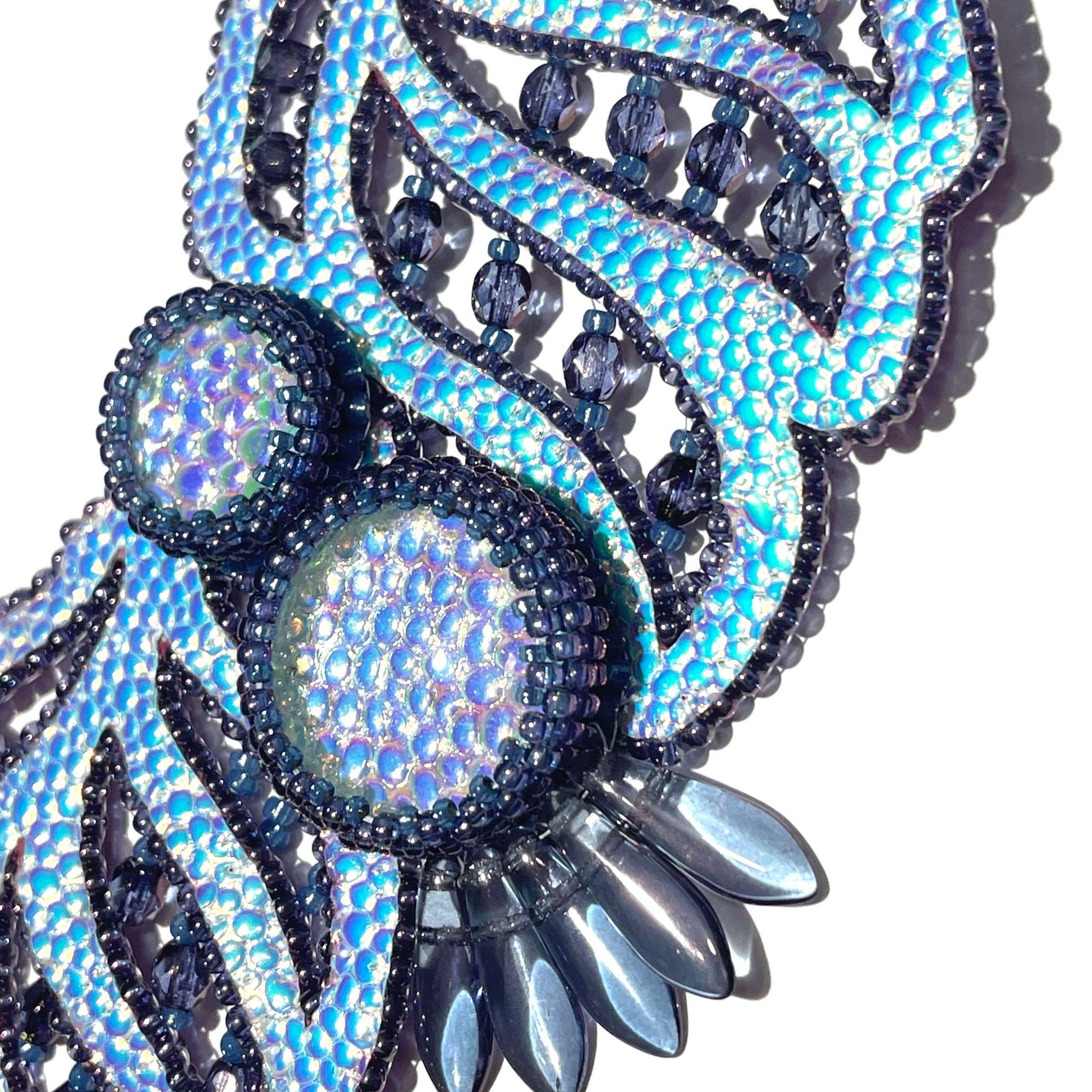 These change colours as they are moved and shift in the light from pale champagne gold colours to blue and purple. They look more blue in the necklace I created as they are bezelled with blue beads.