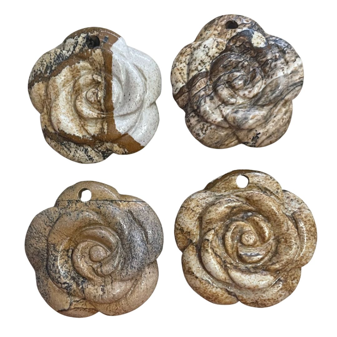 38mm Hand Carved Picture Jasper Rose Gemstone Pendant